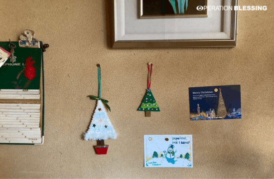 毎年クリスマスの時期になると、手作りオーナメント入りプレゼントを楽しみにしてくださり、今ではすべてをクリスマスカードと共に玄関に飾ってくださっています。